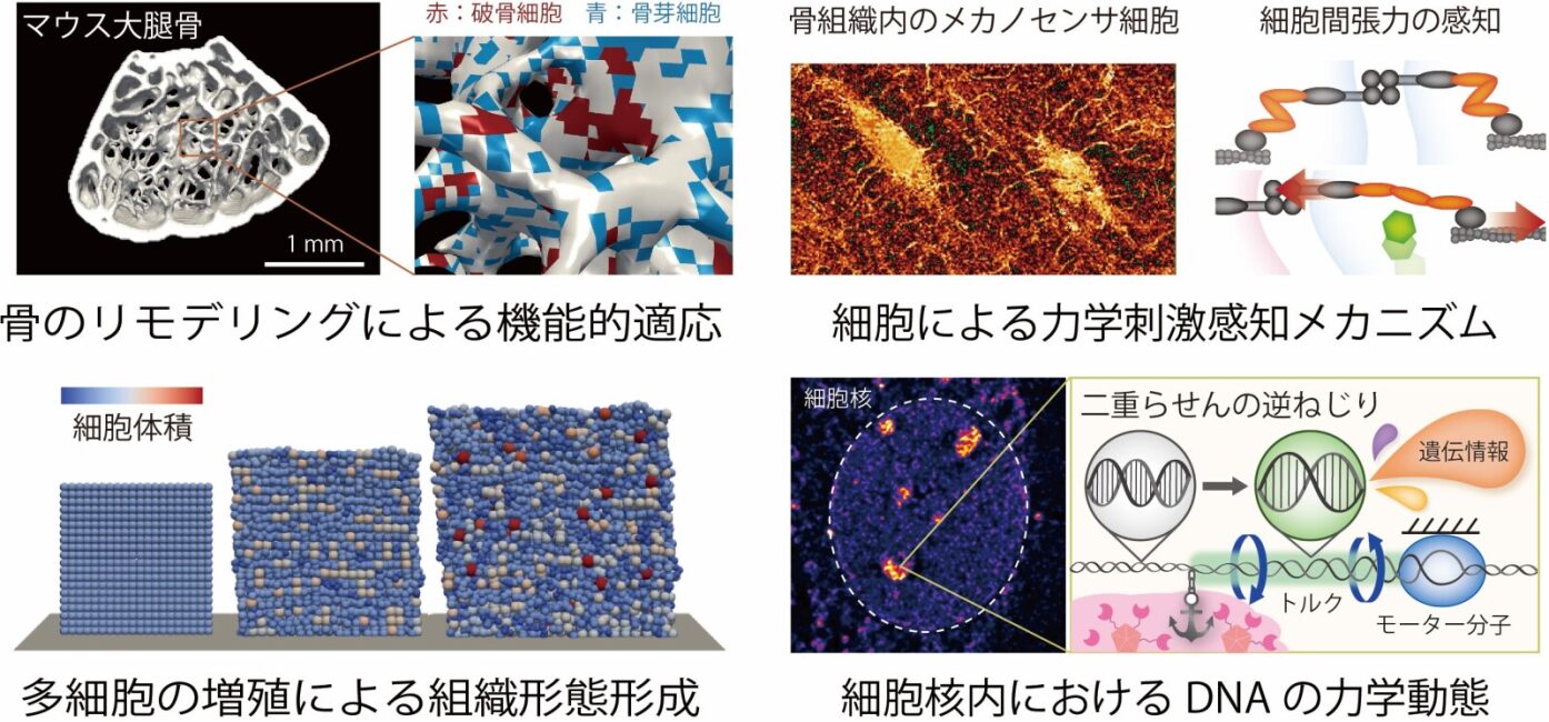 生物の発生過程における細胞分化,形態形成,成長,さらには生体組織・器官のリモデリングや再生による環境への機能的適応など,多様な生命現象における制御メカニズムの解明を目指し,力学を基礎とした学際的研究を行っている.細胞・分子レベルにおける要素過程と,それらの複雑な相互作用により組織・器官レベルにおいて創発される生命システム動態の本質を理解するため,「力学環境への適応性」と「構造・機能の階層性」に着目し,実験と数理モデリングを統合的に組み合わせたバイオメカニクス・メカノバイオロジー研究を進めている.